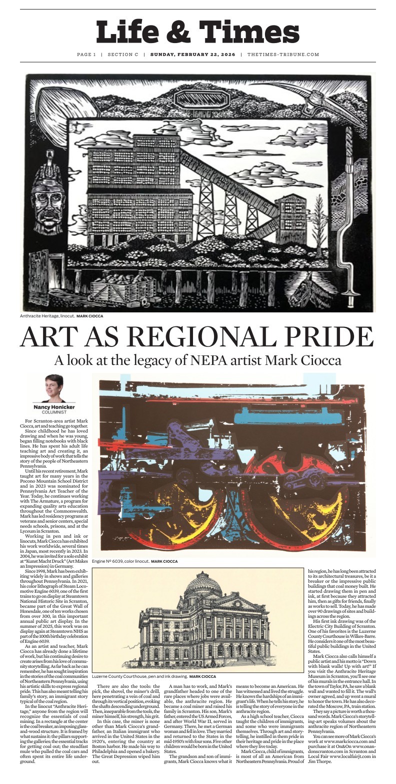 I am inspired by the greater NEPA (Northeastern Pennsylvania) architecture, trains, historical sites, and beyond. The more than eighty fine pen and ink illustrations to date celebrates our shared heritage and history and offers appreciation through this medium.